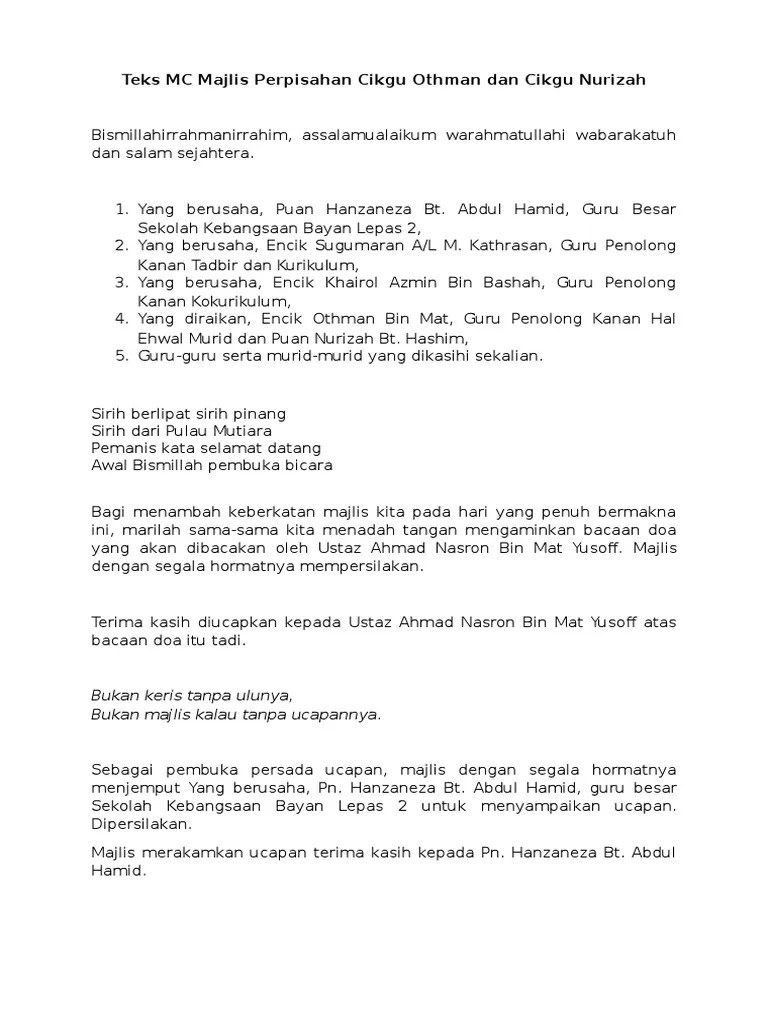Teks pengacara majlis persaraan teks pengacara majlis "kasih disemai bakti dituai" sempena persaraan tuan hj mawardi pagi yang indah penuh ceria. Hari yang indah penuh ceria hari yang berbahagia penuh bermakna bismillahirrahmanirrahim assalamu `alaikum w.b.t. . Yang berusaha, tn hj hidhir bin ismail , pengetua sma lughatul quran untuk menyampaikan ucapannya. Teks ucapan pengacara majlis persaraan. Contoh teks pengacara majlis / ucapan emcee majlis persaraan cikgu. Teks pengacara majlis persaraan teks pengacara majlis "kasih disemai bakti dituai" sempena persaraan tuan hj mawardi pagi yang indah penuh ceria.